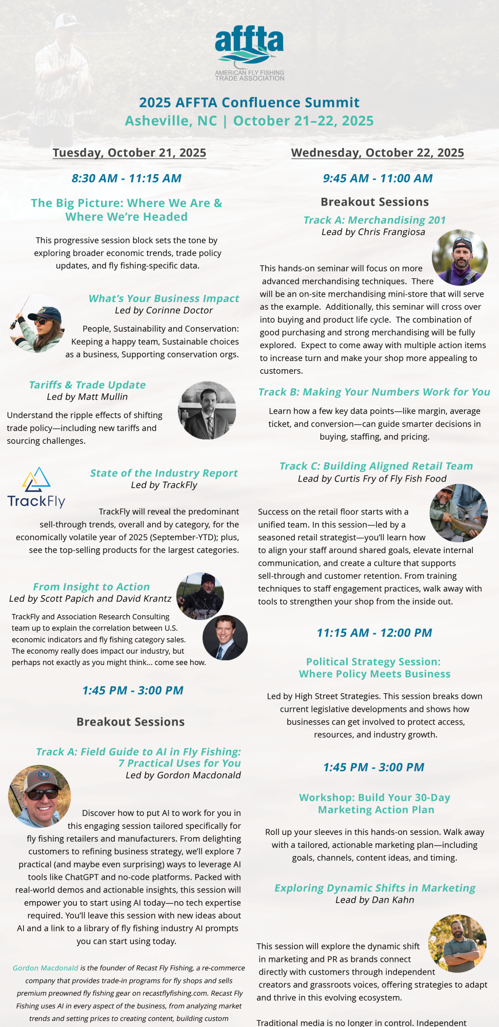 2025 AFFTA Confluence Summit – Asheville, NC | October 21–22, 2025 The 2025 AFFTA Confluence Summit, scheduled for October 21–22 in Asheville, North Carolina, is the premier annual gathering for the fly fishing industry. Hosted by the American Fly Fishing Trade Association (AFFTA), this summit brings together manufacturers, retailers, guides, outfitters, conservationists, and media professionals to collaborate on the future of fly fishing. Why Attend? Reservation Deadline: September 29th, 2025